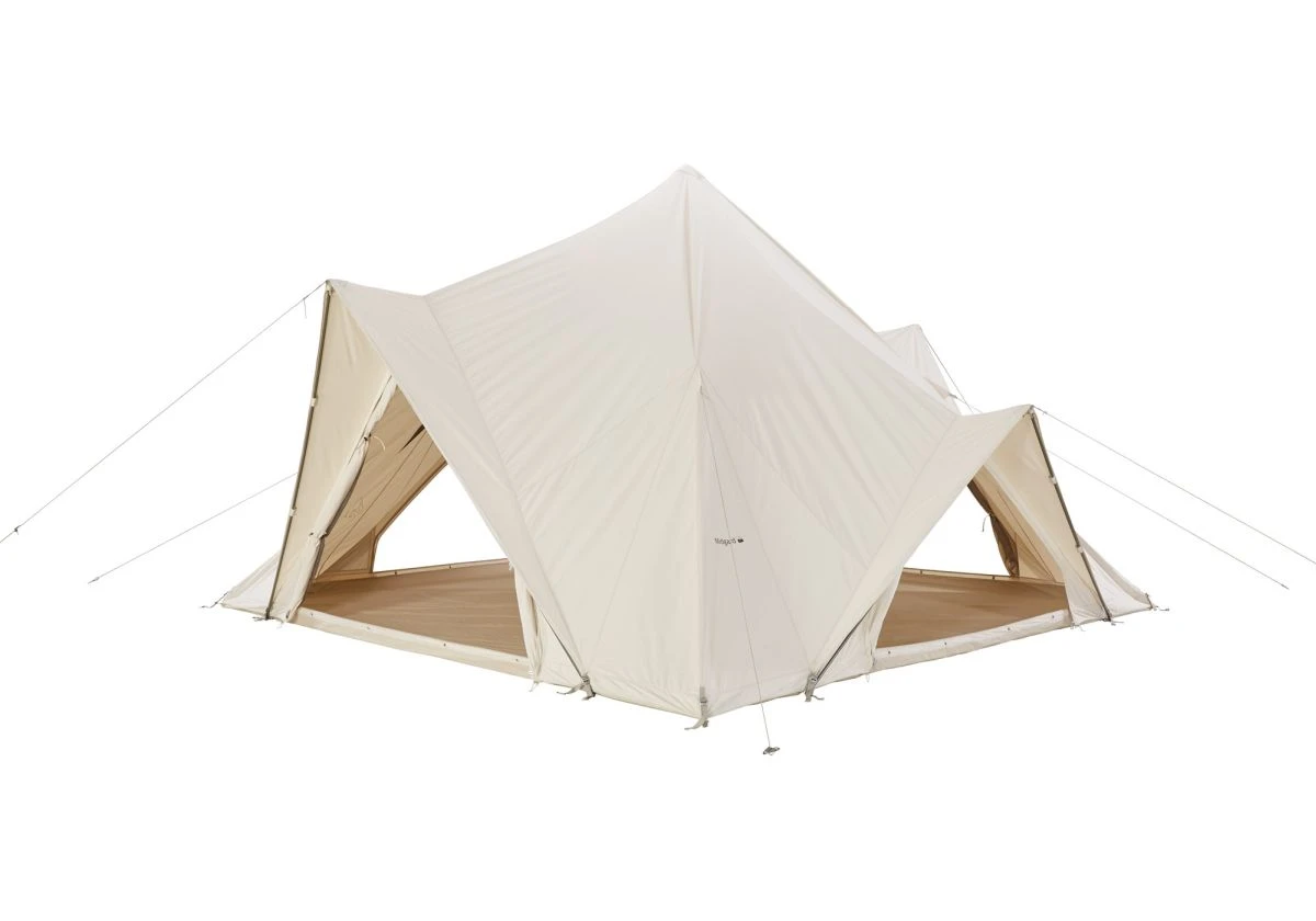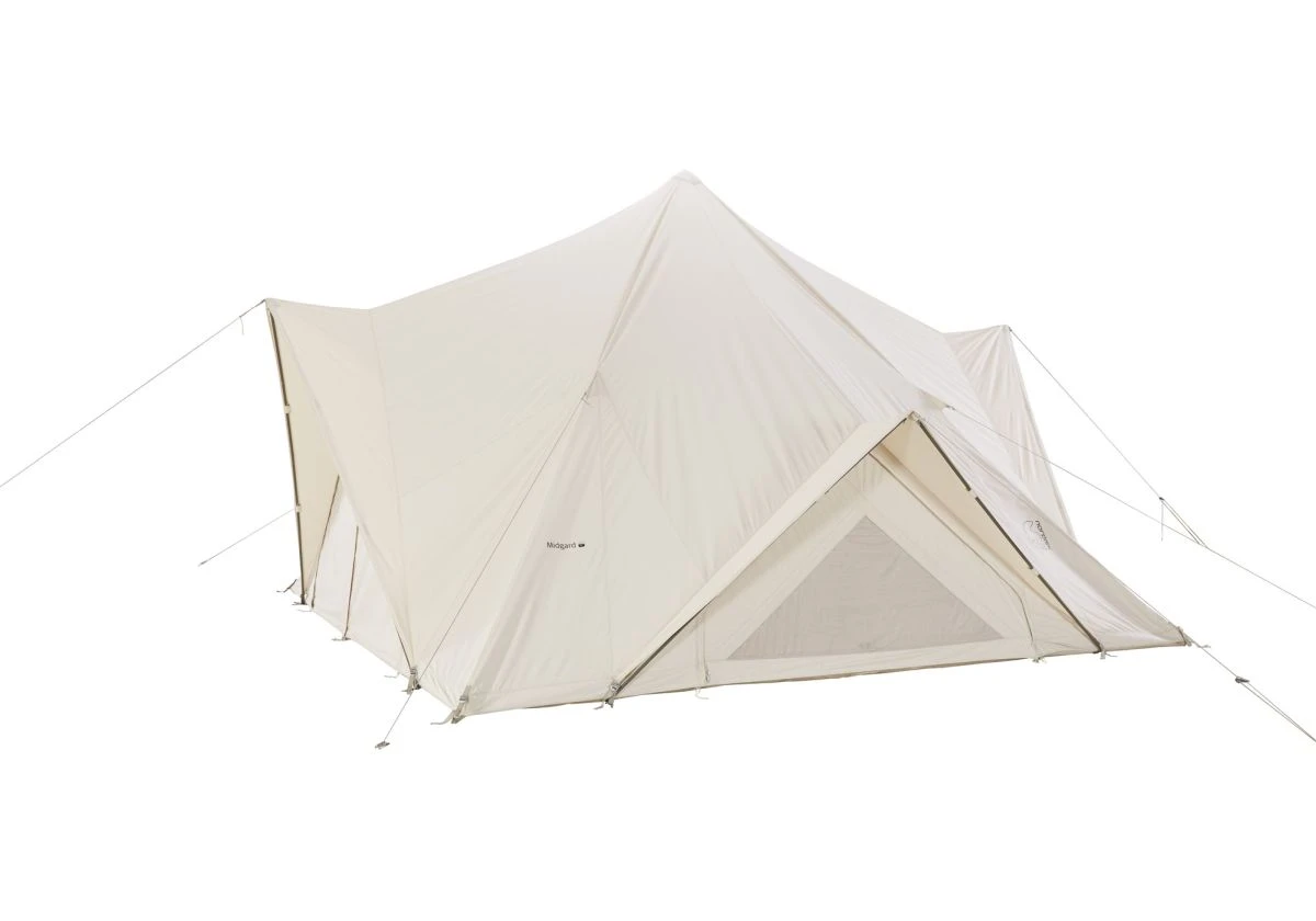 Midgard 20 m² kann als zentrale Komponente eines gekoppelten Aufbaus mit den Vimur Firstzelten der Midgard Zeltserie oder auch als geräumiges, komfortables und individuelles Gruppenzelt eingesetzt werden. Der Aufbau eines einzelnen Zeltes ist sehr einfach, da zur Verankerung nur 16 Heringe erforderlich sind. Durch die großzügig bemessenen Fenster und die Türen aus Moskitonetz gelangt besonders viel Luft und Licht ins Zeltinnere. Das große Vordach über dem Eingang schützt vor Witterungseinflüssen und ermöglicht offene Türen – selbst bei Nieselregen. Die patentierten Turtle Hub™ Gestängeverbinder aus dem Hause Nordisk kombinieren innovative Technologie mit historisch inspirierten Designs und Funktionen.
