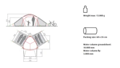 • Überzelt: Zusammensetzung: 65% Polyester, 35% Baumwolle, Konstruktion: Schweres Zelttuchgewebe mit atmungsaktiver Beschichtung, Gewicht 185 g/m2, Farbe: Natural