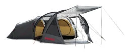 Das Primus Bifrost Y6 Zelt hat zwei getrennten Schlafbereichen für jeweils 3 Personen, die durch eine Kuppel miteinander verbunden sind. Das Zelt ist ideal für mehrere Personen mit großem Platzbedarf. Das Außenzelt besteht aus PU-beschichtetem Polyester und hat eine Wassersäule von 3000 mm. Das Innenzelt besteht aus Oxford Polyester-Gewebe. Der Boden hat eine Wassersäule von 7000 mm. Das Zelt ist mit Sturmleinen ausgestattet. Das Bifrost Y6 verfügt über blickdichte Fenster und einen Boden, der einfach in den Wohnbereich eingeknöpft wird. Zudem wird das Zelt jetzt mit zusätzlichen Aufstellstangen ausgeliefert, um den Eingangsbereich vor Regen und Sonne zu schützen.