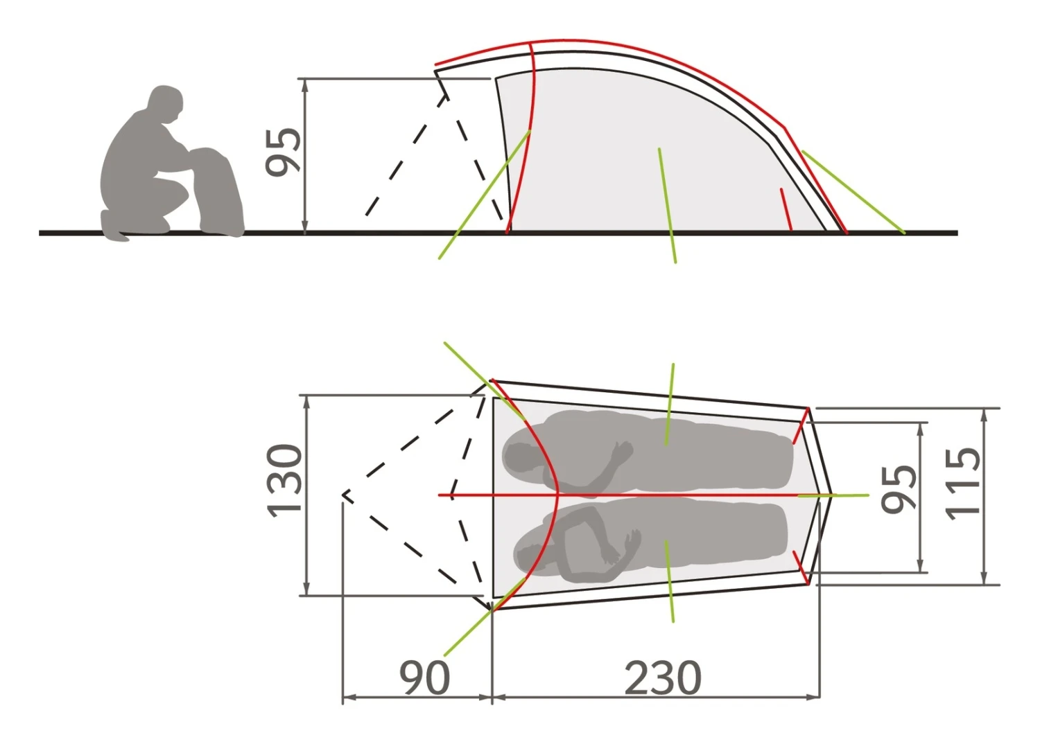 optimierte Raumausnützung durch abgewinkeltes Gestänge im Fußbereich und zusätzlichen Pins im Außenzelt